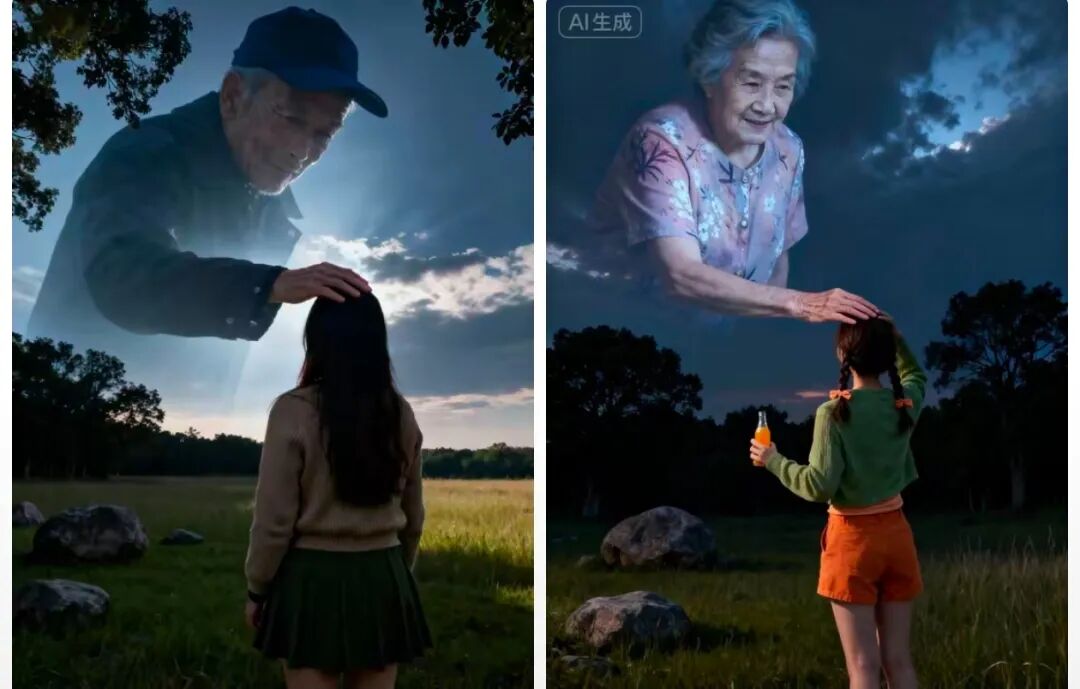 场景对比:现实的背影 + 天空的幻象,营造出“阴阳相隔又温柔相见”的氛围,动态光影与虚实结合的合成手法,使画面具有“梦境感”与“治愈感”。
