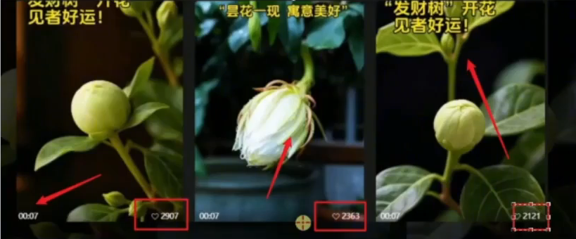之前有粉丝向我询问视频号开花视频的制作方法,因为它的播放量十分可观,像玫瑰花、发财树、昙花这类的相关视频都有不错的流量表现。